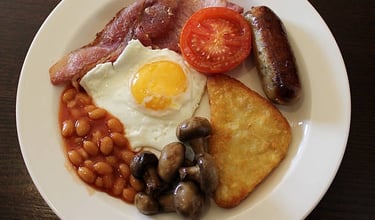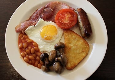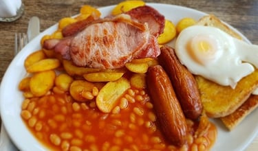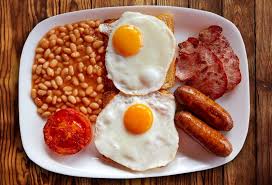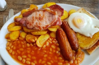 Enjoy savory beef sausage, two fried eggs, crispy bacon, baked beans, grilled tomatoes, and three slices of toasted bread for a delicious and filling morning meal.