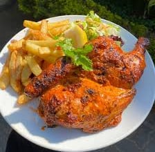 Savor a juicy half chicken served with crispy chips and a fresh salad, offering a delicious and satisfying meal.