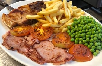 Indulge in a mini steak, crispy bacon, beef sausage, two fried eggs, grilled tomato, onion, baked beans, and four slices of toasted bread with spreads for a hearty meal.