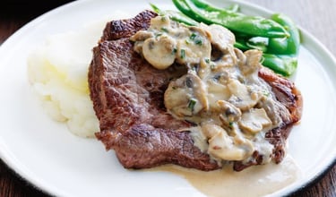 Enjoy a tender beef rump served on a sizzling hot steel plate, topped with a rich and savory mushroom sauce for a mouthwatering experience.