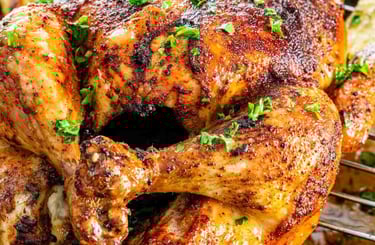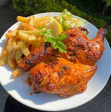 Enjoy a succulent whole chicken served with crispy chips and a fresh, vibrant salad, perfect for a hearty and balanced meal.