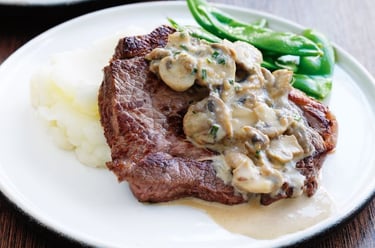 Savor a perfectly grilled T-bone steak topped with a rich and creamy mushroom sauce, offering a deliciously satisfying meal.